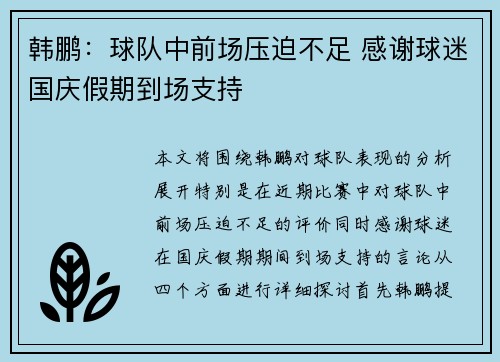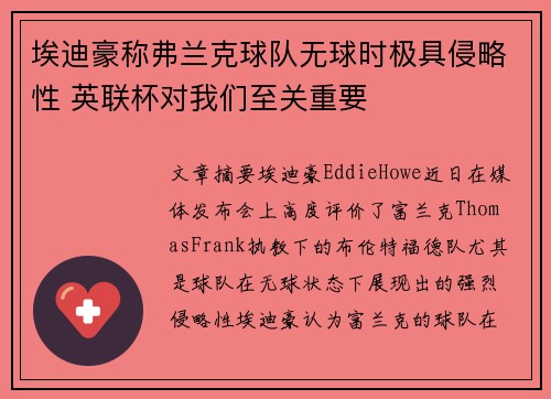 本文聚焦于主教练阿诺德在赛前新闻发布会上所表达的强烈信念:面对即将与沙特的关键对决,伊拉克队将以“唯有胜利至上”为目标,全力出击、防守警惕、争取三分、不退缩。从整体战略部署、心理态势构筑、战术执行细化和对手情报防范四个维度深入解析阿诺德的表态背后的含义与实践路径。首先,文章将探讨伊拉克队在战略层面的“唯胜利至上”理念如何转化为具体目标与团队凝聚力;其次,分析球员心理状态和团队氛围的建设,如何为“全...